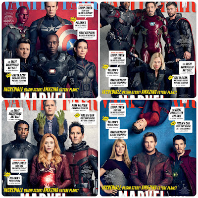 "Avengers: Infinity War" tem direito a quatro capas distintas na revista Vanity Fair. Note-se que alguns dos personagens apresentam visuais diferentes ao que vão apresentar no filme, pelo menos no inicio. Quem sabe se entre as batalhas com os esbirros de Thanos o ex-Capitão América tem tempo para fazer a barba e retomar o uniforme, e SPOILERS Thor regenera um olho /SPOILERS . Talvez cortesia do Doutor Estranho? Vamos então ver as capas que juntam os diversos núcleos de super-heróis do Universo Cinemático da Marvel: O Visão, Steve Rogers anteriormente conhecido como Capitão América, o Gavião Arqueiro, Máquina de Guerra e a Vespa. Falcão, Homem de Ferro, Thor e Viúva Negra. Bruce Banner/Hulk, Pantera Negra, Feiticeira Escarlate e Homem-Formiga. O Puto-Aranha, Pepper Pots, Senhor das Estrelas e Doutor Estranho.